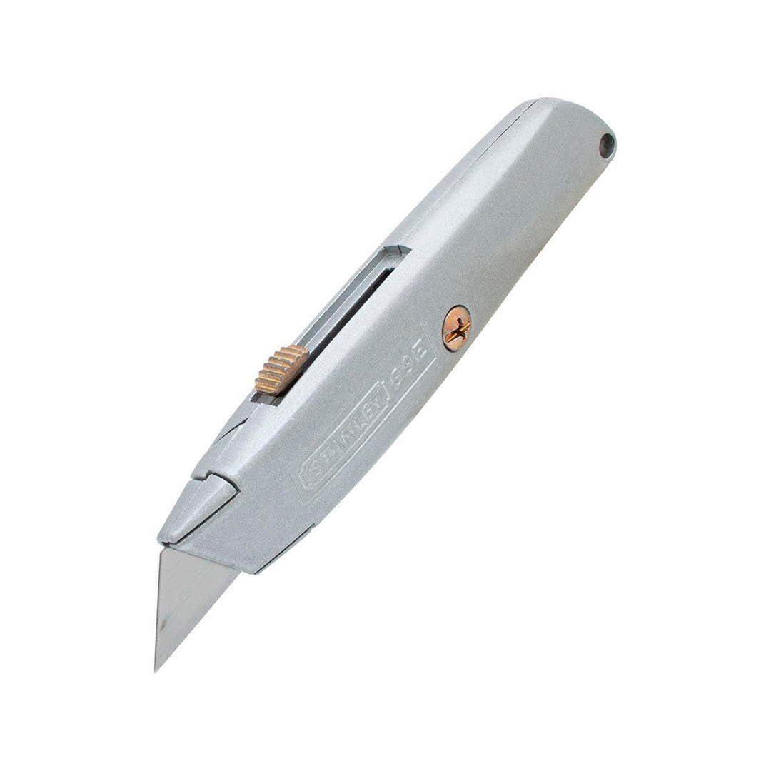 Un cuchillo de hoja retráctil con un elegante cuerpo de zinc pintado en gris. Este resistente cuchillo cuenta con un resorte adicional interno de acero para mayor durabilidad. Además, se suministra con 5 hojas en su interior para una conveniente reposición. El diseño innovador de su parte superior garantiza la seguridad y firmeza de la hoja en su posición, evitando cualquier deslizamiento indeseado.