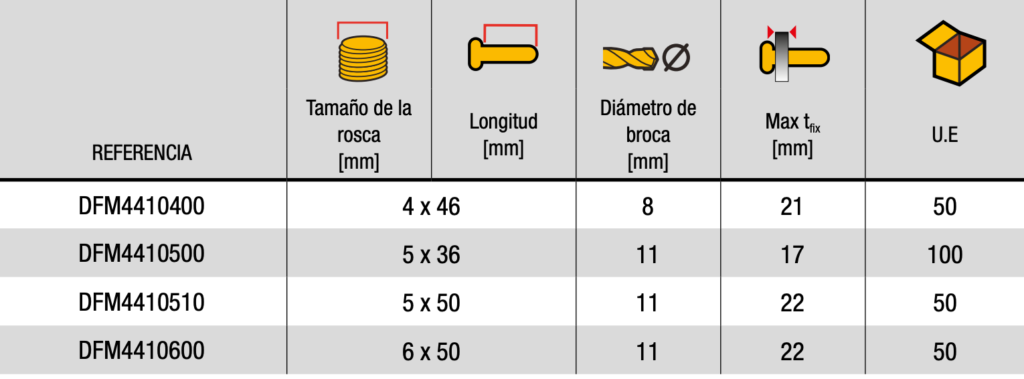 Ideal para Paredes Huecas: El taco metálico Dewalt DFM4410600 es especialmente adecuado para su uso en paredes huecas de placa de yeso o ladrillo, brindando una sujeción sólida y segura en este tipo de materiales.
