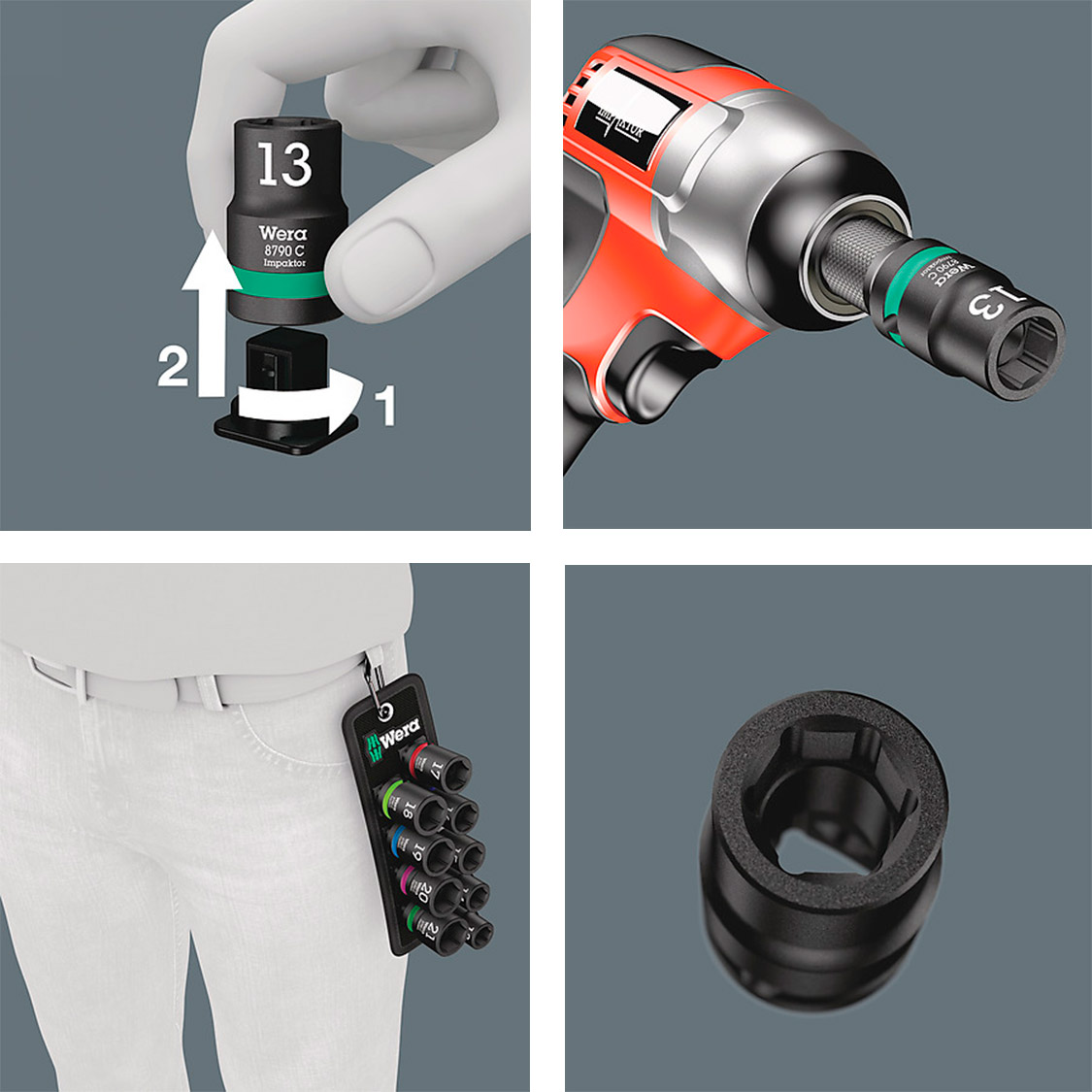 Juego de vasos de impacto Wera Belt C Impaktor 1, con correa textil y nueve vasos de alta resistencia para llaves de impacto de 1/2".