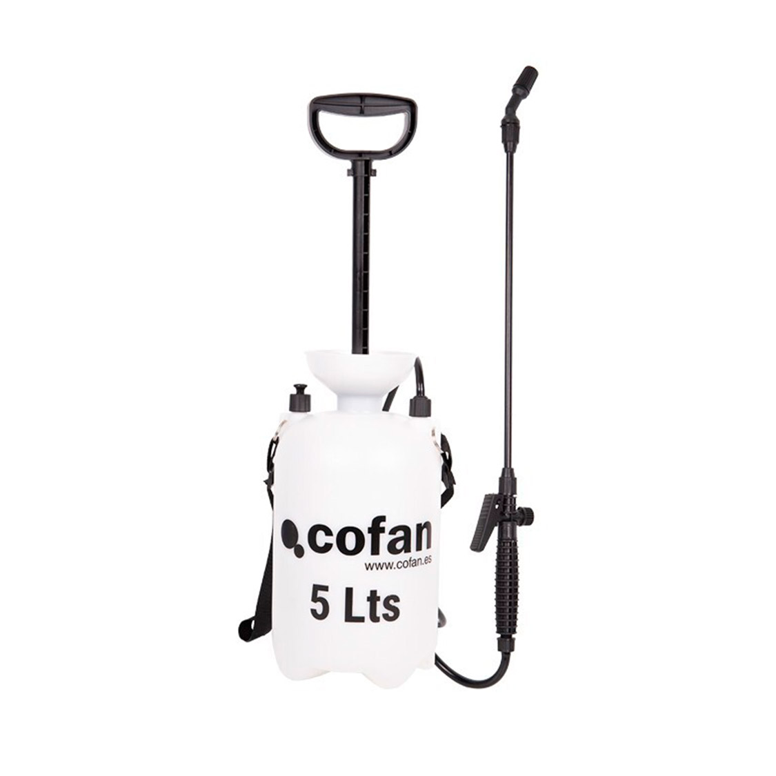 Pulverizador manual a presión de 5 litros en color blanco y negro, con válvula de seguridad automática, ideal para uso agrícola y de jardinería