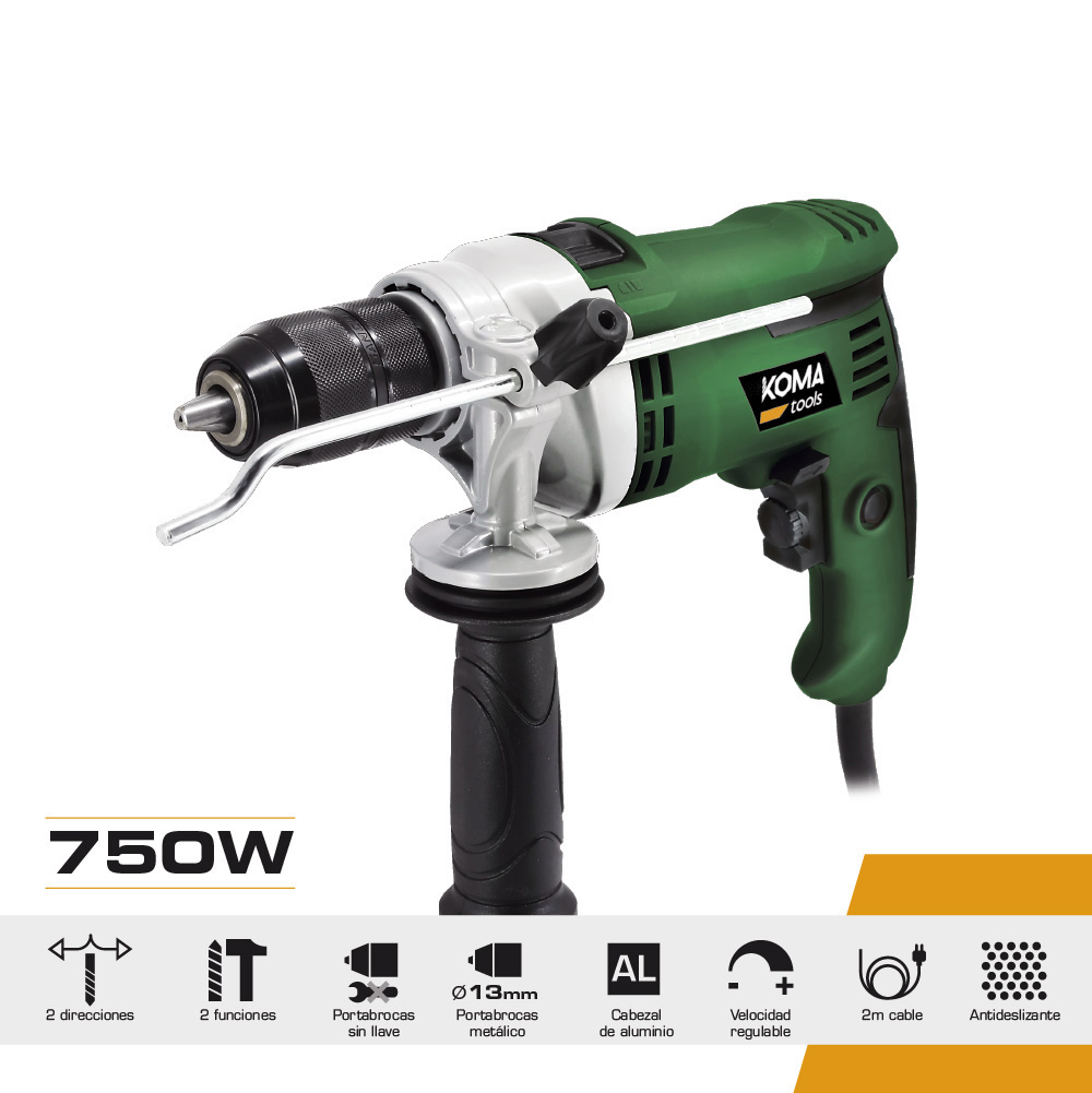 El Taladro Percutor Koma Tools de la serie Brico combina potencia y versatilidad para satisfacer tus necesidades de perforación en diversos materiales. Con una potencia de 750W y velocidad variable de 0 a 2600 rpm, este taladro percutor es ideal para trabajos tanto en madera como en metal y hormigón.